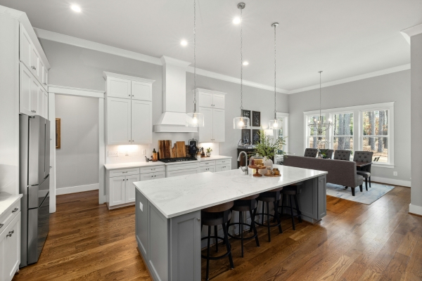 Modern and luxurious kitchen layout with a center island for dining or cooking.